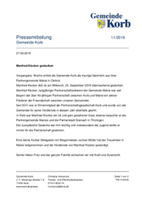 Pressemitteilung 11/2019 Gemeinde Korb 27.09.2019 Manfred Klocker gestorben Vergangene Woche erhielt die Gemeinde Korb die traurige Nachricht aus ihrer Partnergemeinde Matrei in Osttirol. Manfred…