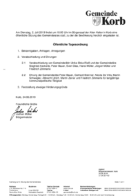 signiert Bürgermeisteramt Korb 07.10.2019 13:08:15 +02 Am Dienstag, 15. Oktober 2019 findet um 19:15 Uhr im Saal des Evangelischen Gemeindehauses in Korb-Kleinheppach eine öffentliche Sitzung des…