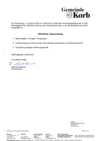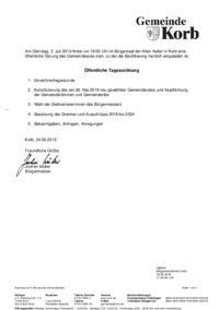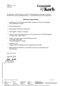 signiert Bürgermeisteramt Korb 18.07.2019 15:07:59 +02 Am Dienstag, 23. Juli 2019 findet um 19:00 Uhr im Bürgersaal der Alten Kelter in Korb eine öffentliche Sitzung des Gemeinderates statt, zu der…