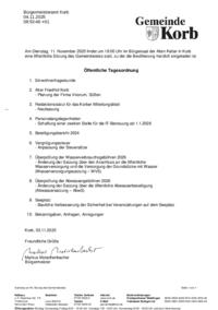 Bürgermeisteramt Korb 04.11.2025 08:53:46 +01 Am Dienstag, 11. November 2025 findet um 18:00 Uhr im Bürgersaal der Alten Kelter in Korb eine öffentliche Sitzung des Gemeinderates statt, zu der die…